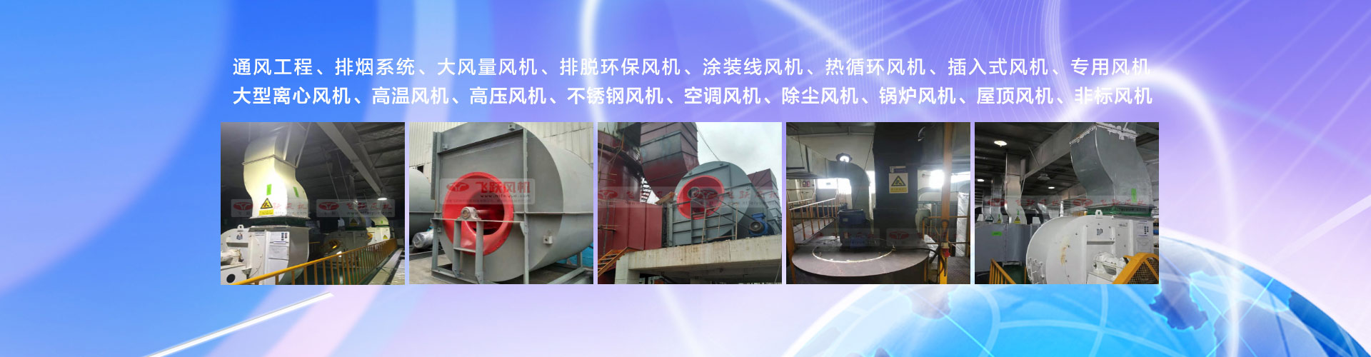 主要產品有:高溫風機、高壓風機、熱循環風機、鍋爐風機、除塵風機、不銹鋼風機、輸送風機、屋頂風機、紡織風機、空調風機、專用風機,非標風機等品種齊全!熬仂`”系列風機產品,以優良的性能,卓越的品質獲得了廣大用戶的廣泛好評。